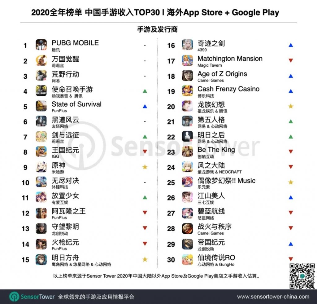 ,数据显现,2020 年共 37 款我国手游在海外商场的收入逾越 1 亿美元,而 2019 年仅 25 款到达这一里程碑。依据陈述,出海收入 Top 30 手游产品在 App Store 和 Google Play 的总收入到达 92.4 亿美元,较 2019 年 63 亿美元增加 47%。
